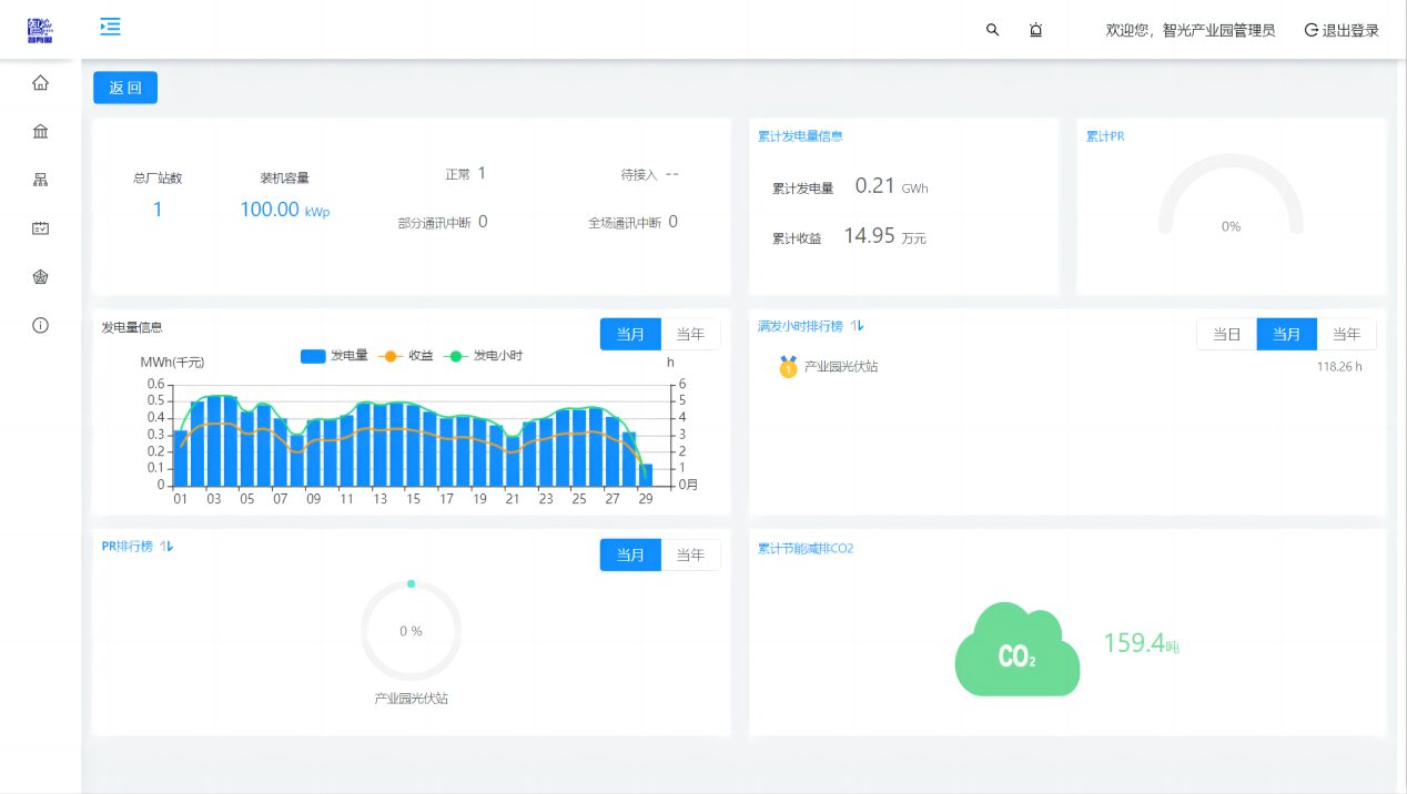 綜合數(shù)據(jù)大屏包括“項目介紹”、“電站總況”、“實時數(shù)據(jù)”三個輪播頁面。卡片形式呈現(xiàn)當日/當月/累計總發(fā)電量、當日/當月/累計收益、逆變效率、當月每日發(fā)電量柱狀圖、當日電站功率曲線圖,并實時展示當月二氧化碳減排量、當前環(huán)境溫度、當前輻照強度、當前風速、累計二氧化碳減排量等節(jié)能指標。