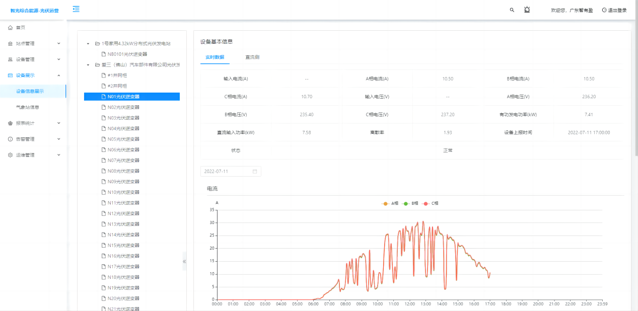 展示電站對應的設(shè)備信息實時數(shù)據(jù),逆變器交流電流、電壓、功率的統(tǒng)計匯總曲線,直流側(cè)電壓電流監(jiān)測,以及氣象站風速、溫濕度、輻射、壓力的數(shù)據(jù)曲線。